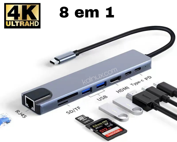 Adaptador de Hub USB Tipo C para PC, Macbook, 8 em 1, 1 a 4k, HDMI, Sd, Tf, RJ45, Leitor de Cartão e Pd
