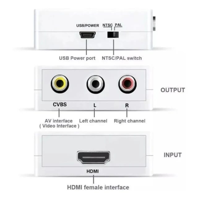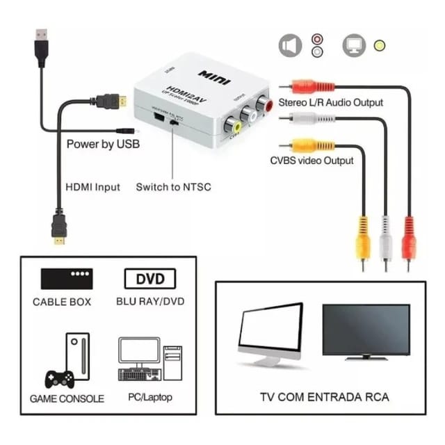 O MINI HDMI para AV conversor de sinal que irá converter o sinal de vídeo HDMI ou sinal de áudio para AV (CVBS) sinal de vídeo composto e FL/FR sinal de áudio estéreo sinais, enquanto o apoio DVI sinais marginalizar sistema. Para ajudar os usuários a converter a alta qualidade do sinal de vídeo HDMI em nominal CVBS normais (standard-definição 480i, 576i). De modo que pode correr na TV, VIDEOCASSETE VHS, gravadores de DVD, etc e suporte NTSC e PAL dois formato de TV.